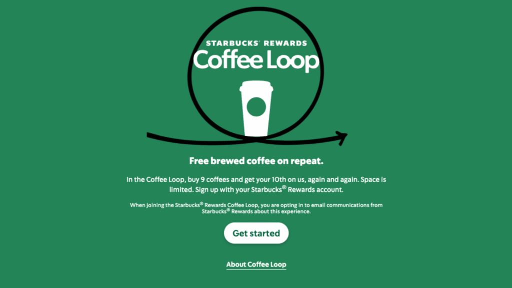 Starbucks is currently piloting a new rewards feature with select members called Coffee Loop, a new iteration of a classic punch card loyalty program. With Coffee Loop, rewards members buy nine brewed coffees and get the tenth for free, with no restrictions on how many times they can use the reward — as the tagline says, it’s “[free] brewed coffee on repeat.”